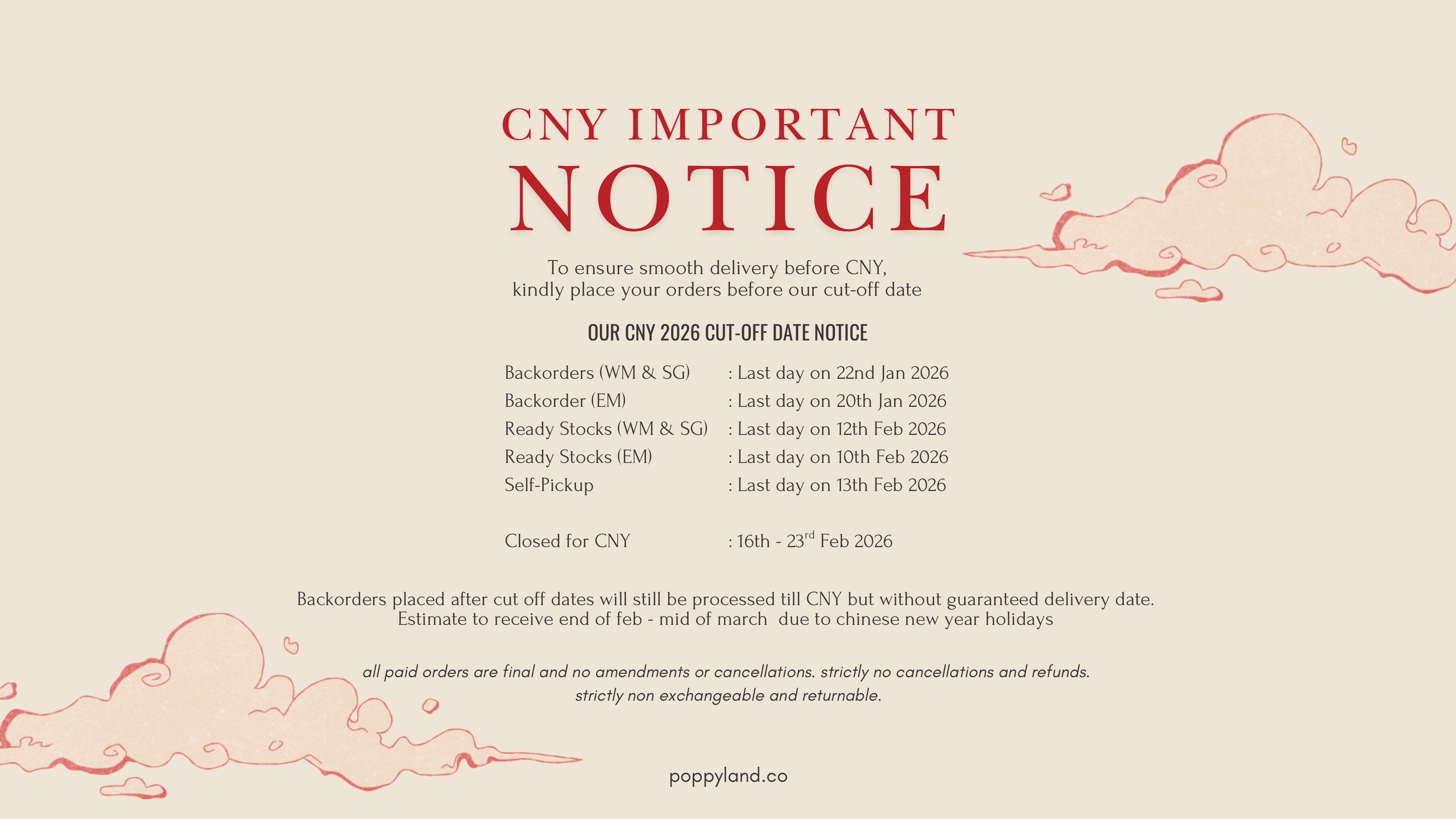 Gentle Reminder: WM & SG Please place backorder items by 25th Jan to receive them before CNY
